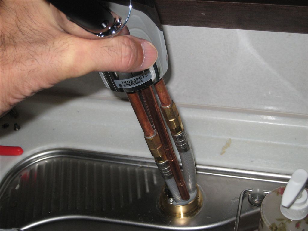 台座を付属の六角レンチでガッチリ固定して、 新しい水栓の給水ホースを順番に挿入 |