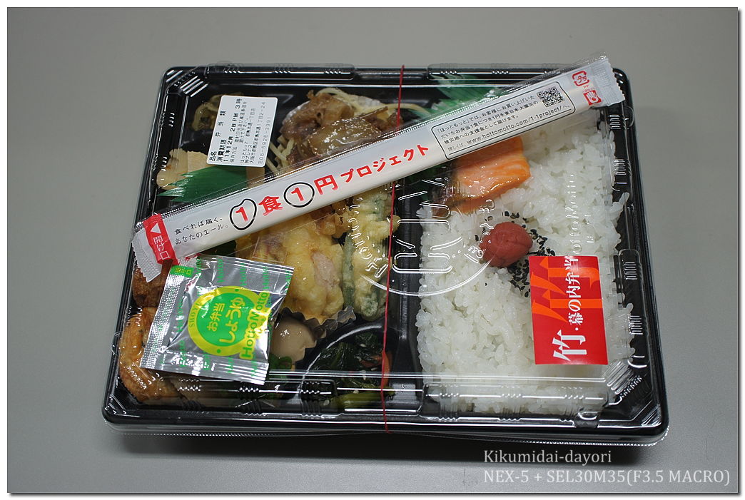 開封前のお弁当。何か、ちょっと分からないが、”1食1円プロジェクト”と箸袋に書かれてある。