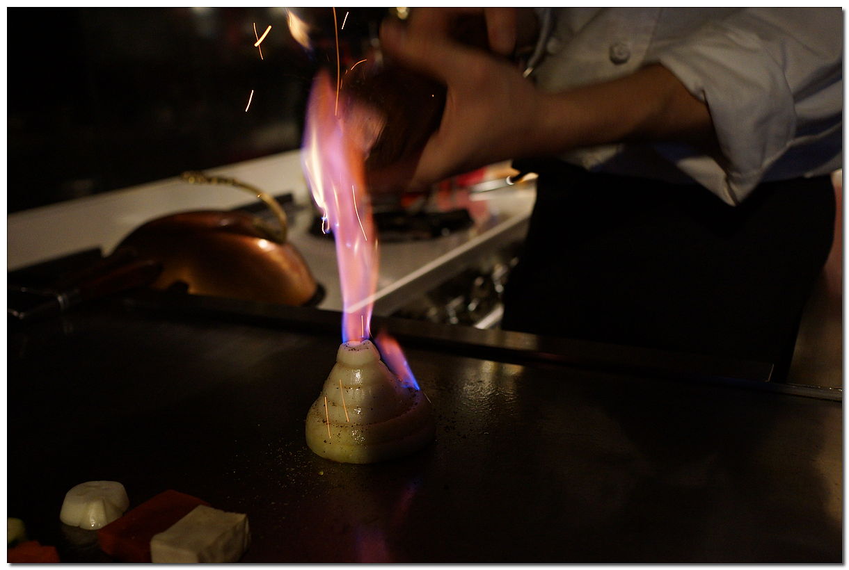 コース料理の最初のスープを鉄板で温めてくれるのだが、けっこう時間がかかる。その間野菜を炒めるのだが、ふたつの輪切り玉ねぎを上手く重ねて、内部に油を注入し、火山風に発火させるというナイスな演出である。