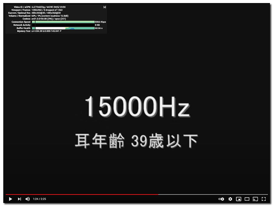 16000Hz以上の音はそもそもYouTubeでは切り捨てられているという疑惑もあるにはあるが、同テストにおいて若者の耳で18000Hzまで聴き取れたとのエビデンスがあるので「その指摘は当たらない」とご理解いただければという風に思っておる次第であります。