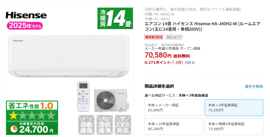 すさまじい低価格である。。これ、いわゆる”6畳用”などではなく、2倍の性能なのだ。※冷房能力4.0kW