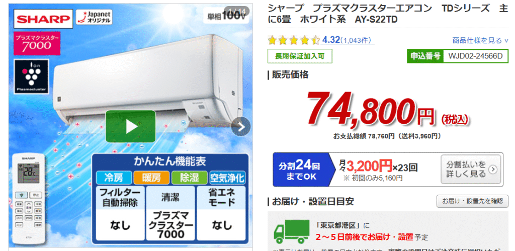 非常にオトクなイメージで売っているジャパネットの最安製品は半分の性能で74,800円。