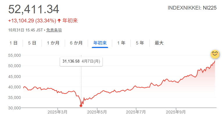 4月のトランプ関税ショックからあっさり乗り越えてからは異常なほどの上昇。この時悲観して「狼狽売り」してしまった人たちはどれほど悔しい思いをしているのだろうか。察するに余りある。(´∀`)