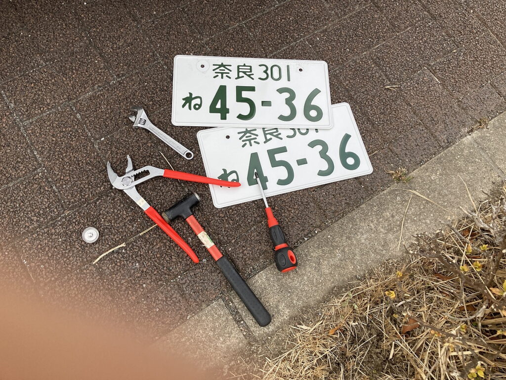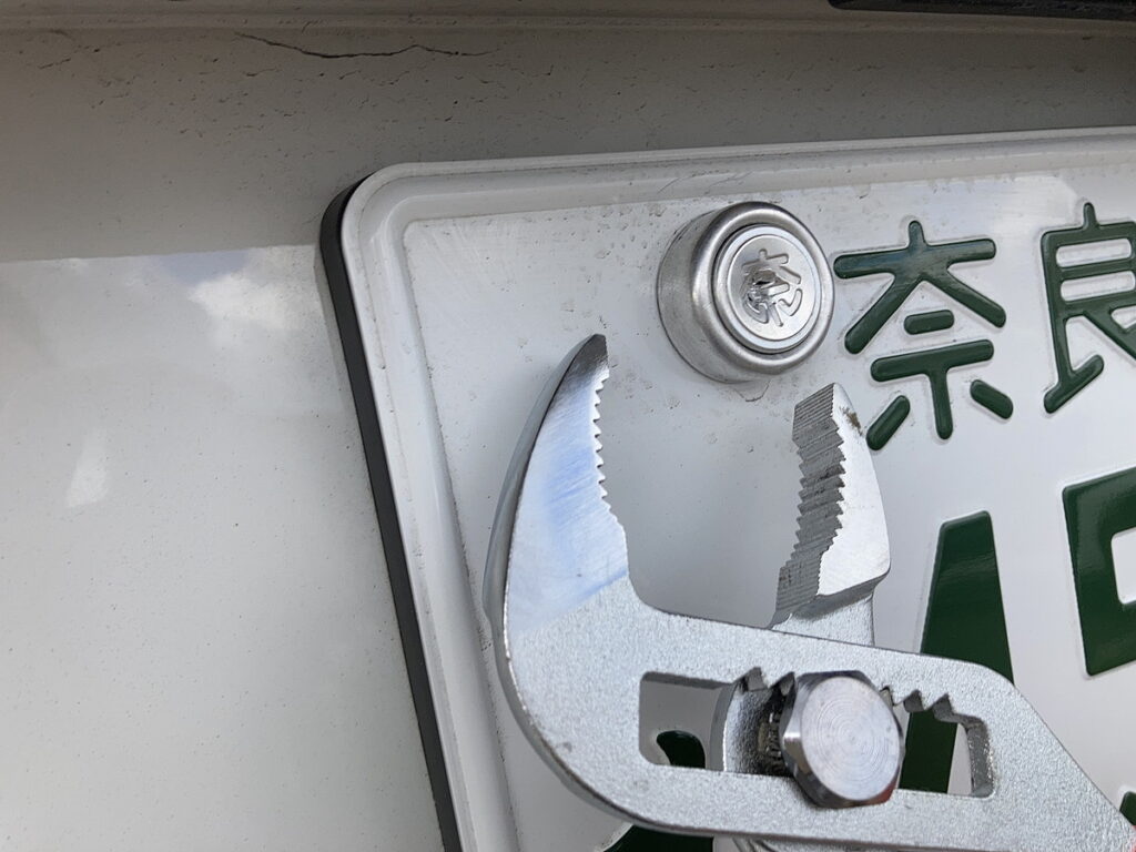 前回、後部ナンバープレートの左側固定ボルトの封緘を外すのに苦労したので、工具持参した。